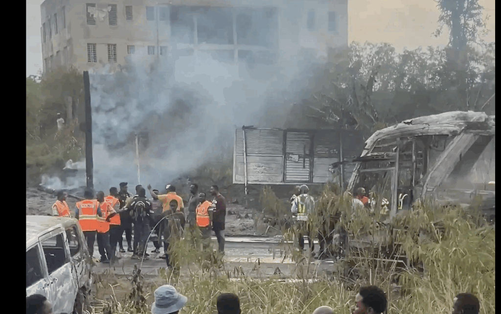 insert_link Local Multiple vehicles burnt as fuel tanker explodes on Nsawam-Accra highway At least seven vehicles have been destroyed in a fire following a fuel tanker explosion on the Nsawam-Accra highway in the early hours of Saturday, February 14, 2026. Preliminary reports indicate that a collision involving the tanker triggered the explosion, with the impact causing the vehicle to burst into flames.Source: www.myjoyonline.comRead full article todayFebruary 14, 2026